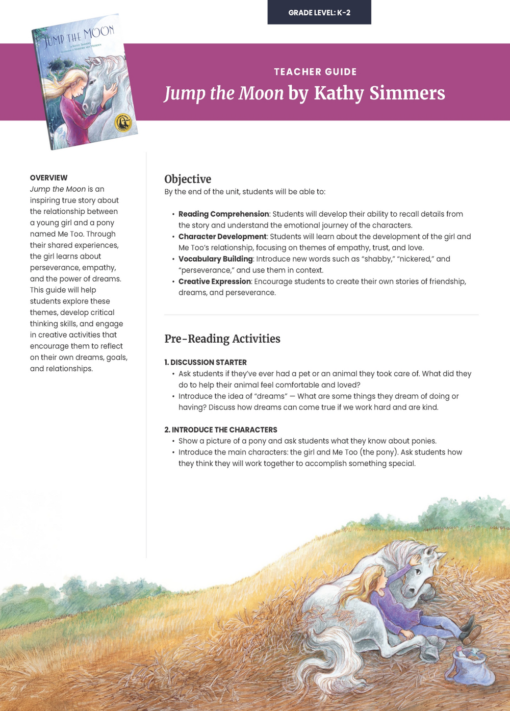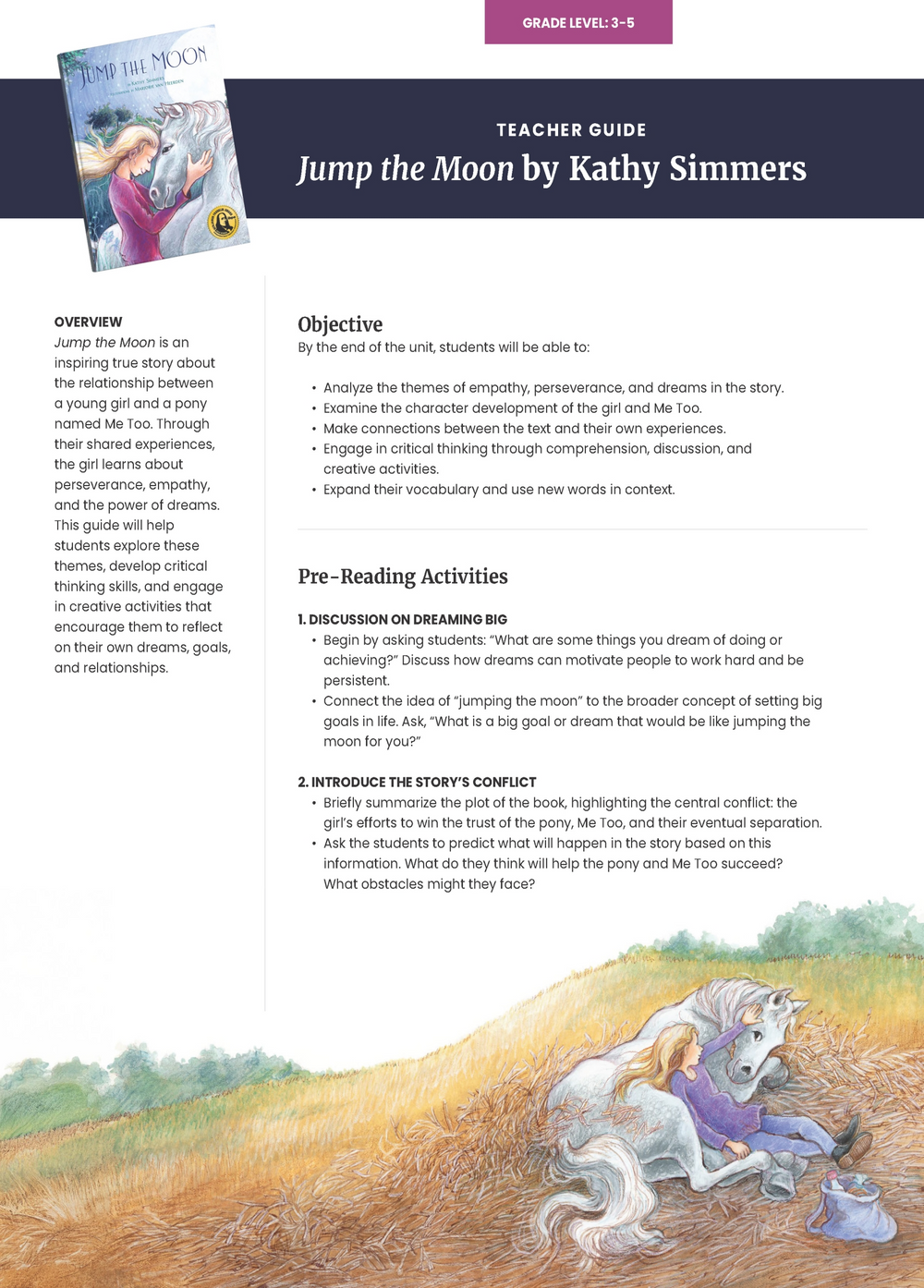 A masterful storyteller, Kathy Simmers, delivers a powerful presentation of the inspiring journey of Jump the Moon to children and adults alike. Describing how the events of this true story impacted her own life, she invites students to put themselves in the story. The life lessons woven throughout Jump the Moon encourage students to dream big and use their imaginations to create their future.